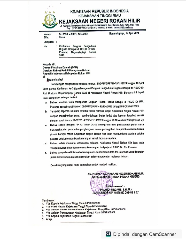 Dalam surat resmi Kejaksaan Negeri Rokan Hilir pertanggal 19 April 2024 nomor B-1359/L.4.20/Fd.1/04/2024 menyebut :
