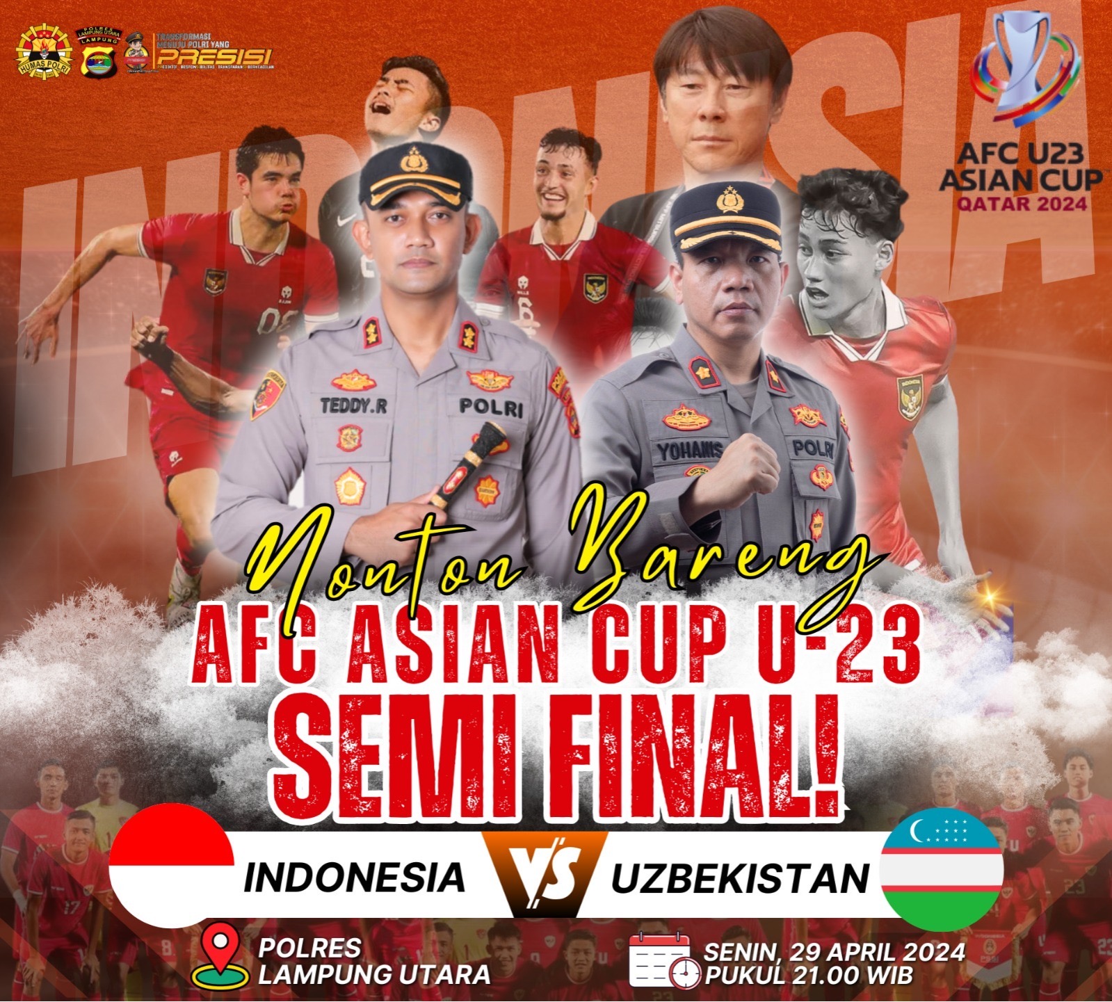 Lampung Utara, www.sinarpagiindonesia.com – Polres Lampung Utara menggelar nonton bareng (Nobar) pertandingan semifinal AFC Piala Asia U23 antara Timnas Indonesia melawan Uzbekistan pada Senin 29 April 2024.