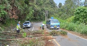 Mengetahui hal tersebut, Polres Pakpak Bharat menerjunkan sejumlah personel dari pos lantas sibande untuk melakukan evakuasi dan pembersihan batang dan ranting pohon yang yumbang tersebut.