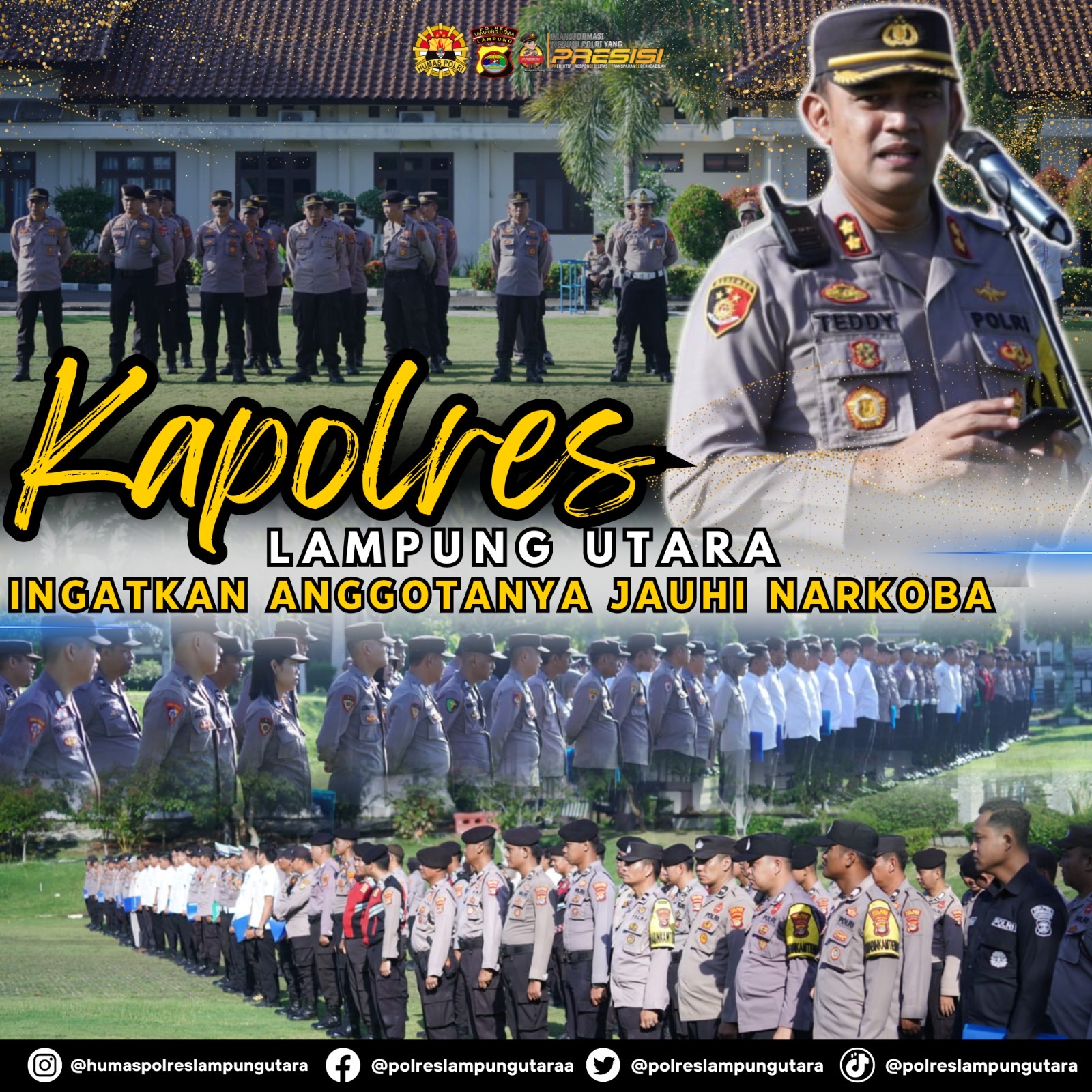 Lampung Utara, www.sinarpagiindonesia.com – Kapolres Lampung Utara AKBP Teddy Rachesna, S.H., S.I.K., M.Si, kembali menekankan kepada seluruh anggotanya agar menjauhi dan tidak terlibat penyalahgunaan narkoba yang menjadi musuh negara.