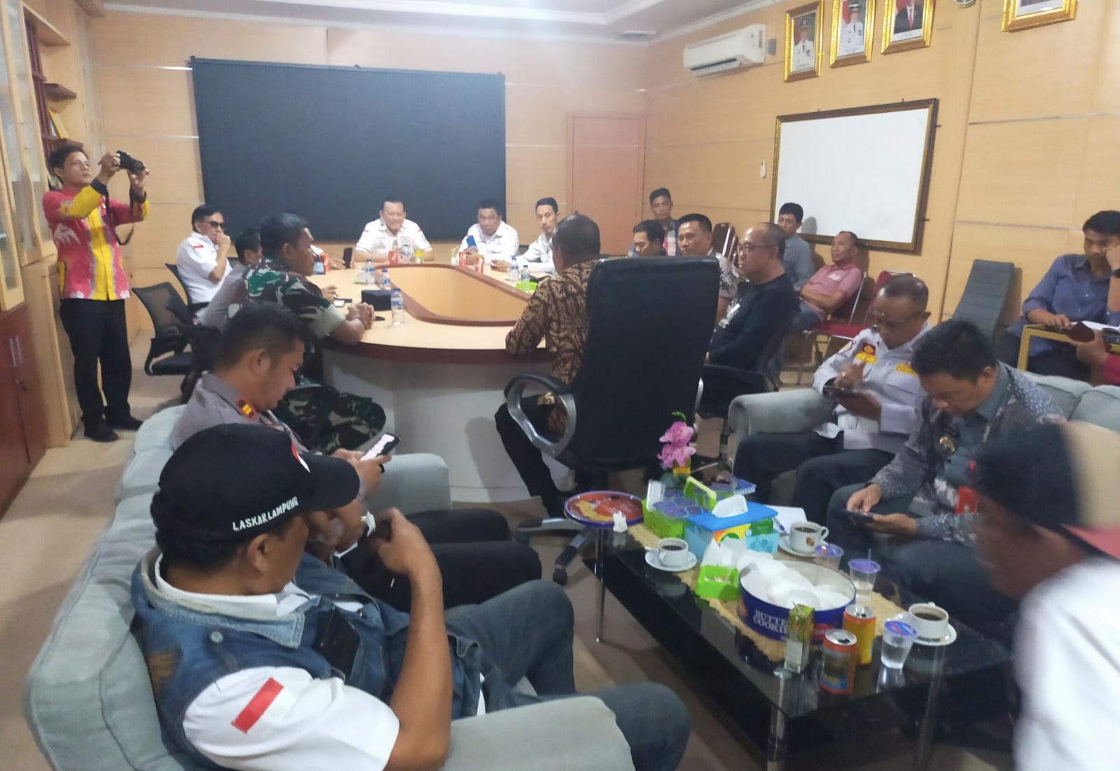 Akhirnya Ketua Umum Laskar Lampung Nero Jelly Agung Putra Kunang bersama Dewan Pembina Irjen Pol (Purn) Ike Edwin beserta pengurus dan perwakilan masyarakat melakukan pertemuan bersama PJ Bupati dan unsur forkopimda di ruang kerja Sekda Lampung Utara. Jumat (17/5/2024).