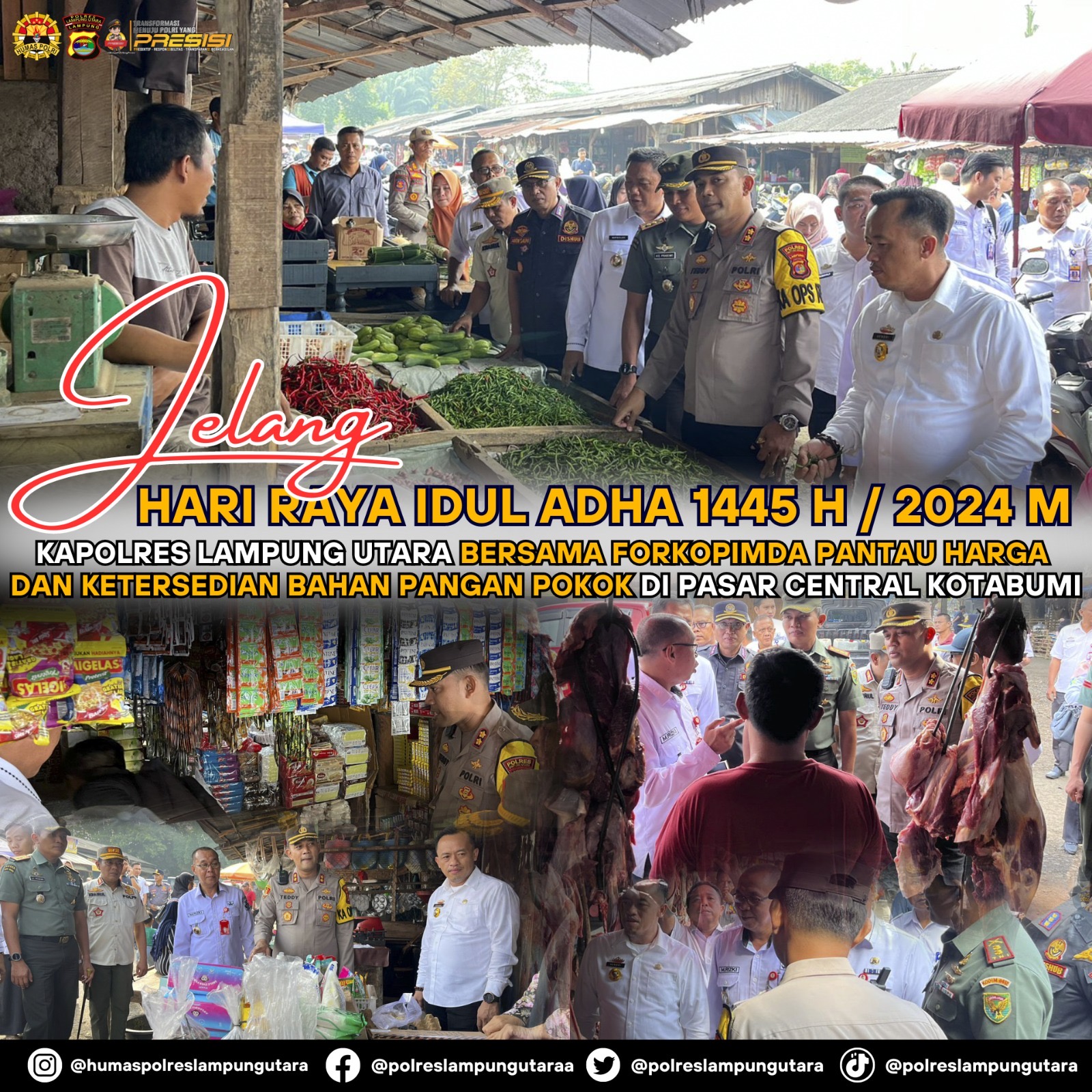 Lampung Utara, www.sinarpagiindonesia.com – Kapolres Lampung Utara AKBP Teddy Rachesna, S.H., S.I.K, M.Si bersama Forkopimda melaksanakan pemantauan harga dan ketersedian bahan pangan pokok di Pasar Central Kotabumi menjelang hari raya Idul Adha 1445 H / 2024 M, Kamis (13/6/24).