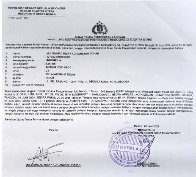 Sejak hari Rabu tanggal 05 juni 2024, telah membuat Pengaduan Penganiayaan ke Polrestabes Medan.