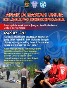 “Saya menghimbau kepada para orang tua untuk melakukan pengawasan terhadap anak-anaknya yang kiranya belum pantas untuk berkendara agar tidak di berikan kendaraan guna mencegah terjadinya kecelakaan lalu lintas khususnya terhadap anak dibawah umur,” tutur Kapolres AKBP Teddy.