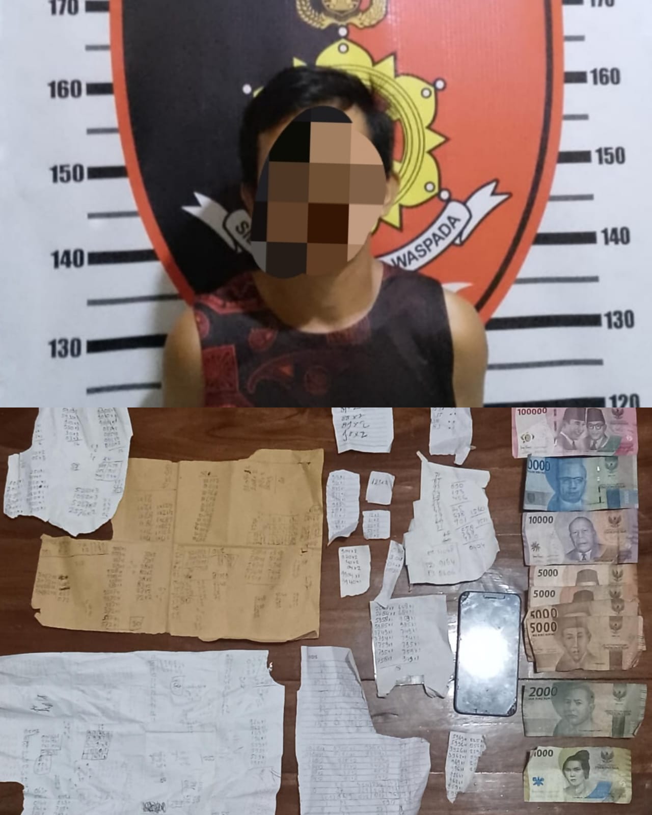 Dari tangan pelaku petugas ikut mengamankan barang bukti 14 kopelan rekap pasangan togel, 27 poto pasangan togel, uang 183 ribu dan 1 unit hp samsung.