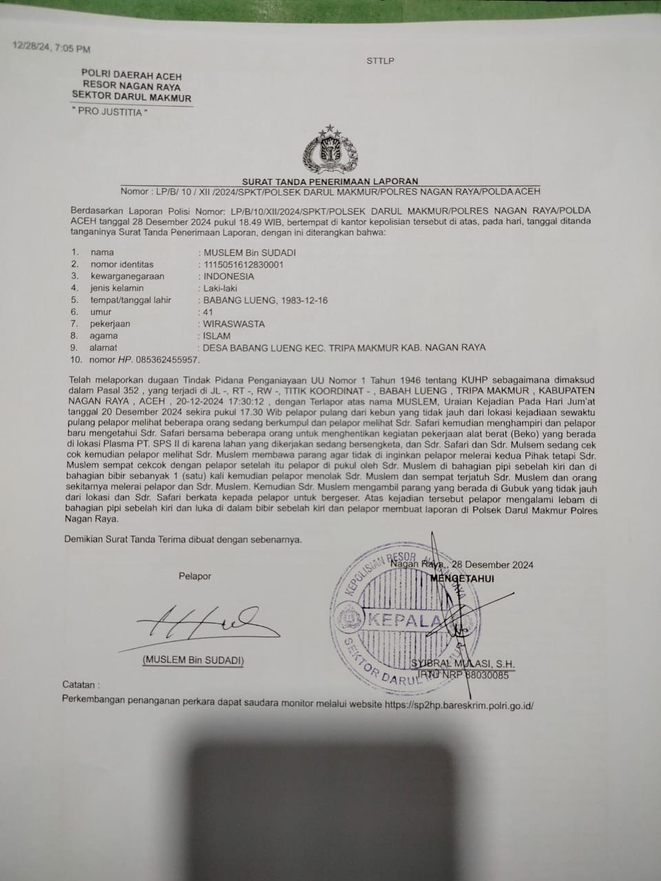 Padahal baru tadi sore kami terima laporan dari korban penganiayaan dengan NO LAPORAN LP/B/10/XII/2024 /SPKT/POLSEK /DARUL MAKMUR/POLRES NAGAN RAYA/POLDA ACEH , tanggal 28 DESEMBER 2024 PUKUL 18:49 WIB