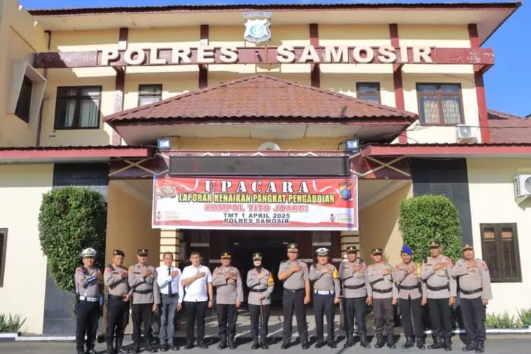 Samosir, www.sinarpagiindonesia.com – Suasana haru dan bangga menyelimuti Mapolres Samosir. Upacara kenaikan pangkat pengabdian dari AKP menjadi Kompol digelar khidmat di Lapangan Apel Mako Polres Samosir. AKP Tito Juardi, NRP. 67060261, Kabag Ops Polres Samosir, resmi menyandang pangkat Komisaris Polisi (Kompol) berdasarkan Surat Telegram Kapolda Sumut Nomor : STR/14/III/KEP/2025 tanggal 28 Maret 2025. Kenaikan pangkat ini berlaku efektifitas.