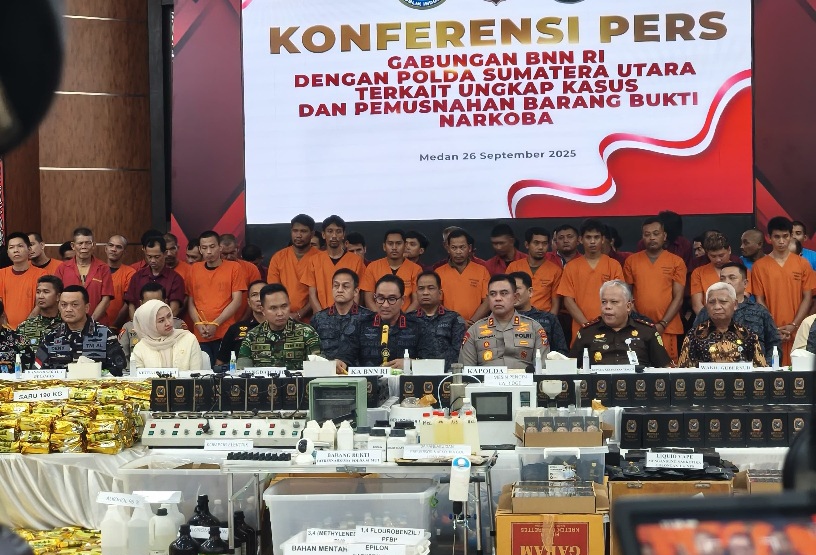 “BNN RI bersama jajaran Polda Sumatera Utara pada Minggu (21/9/2025) berhasil mengungkap 1,4 ton narkotika yang terdiri dari sabu, ekstasi, kokain, dan ganja. Penangkapan ini merupakan hasil kerja keras sepanjang periode 1 Januari hingga 25 September 2025, dengan total 4.749 kasus di seluruh wilayah Polda Sumut serta 6.004 orang tersangka,” ujar Suyudi.