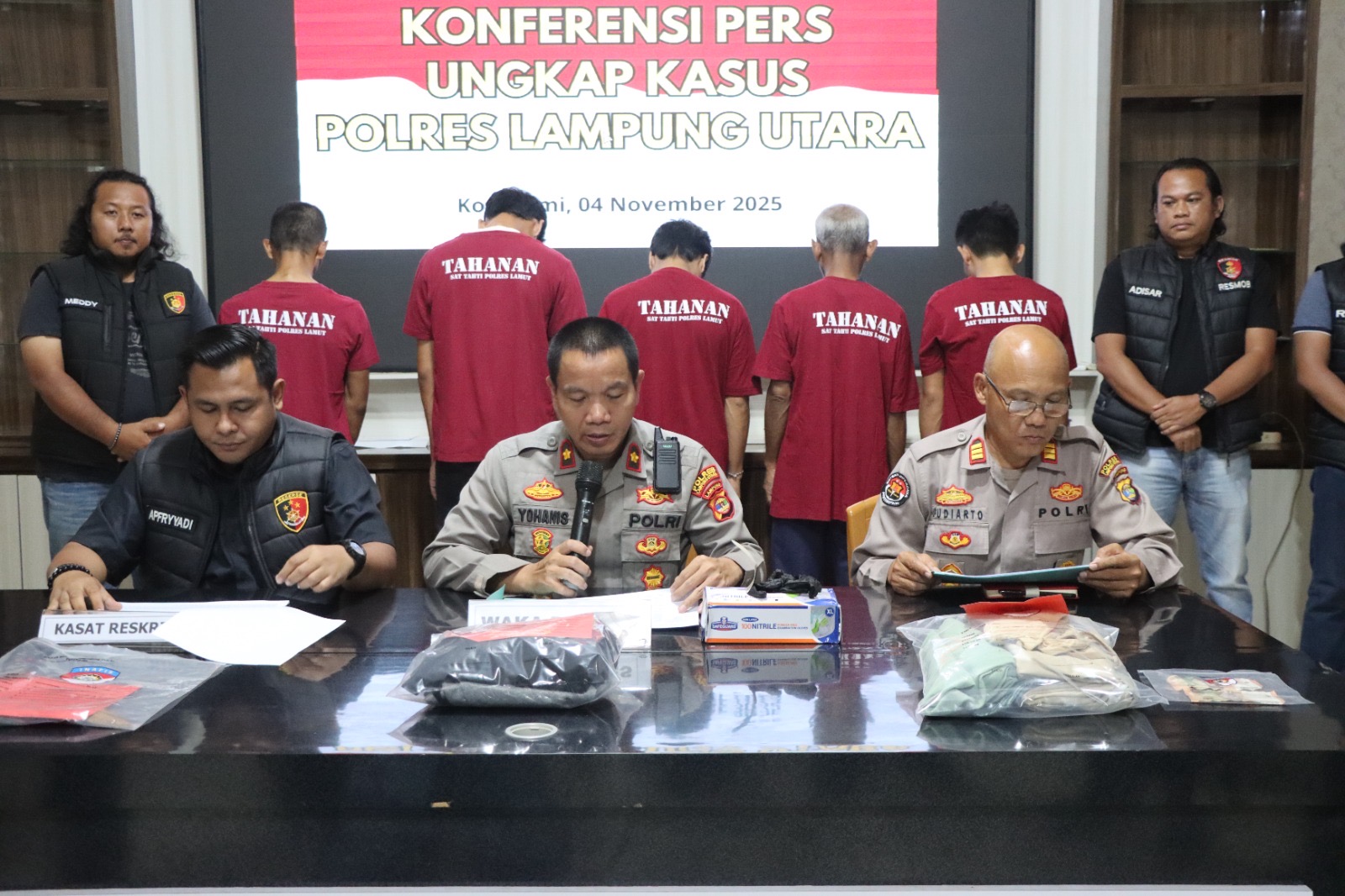 Hal tersebut disampaikan oleh Waka Polres Kompol Yohanis mewakili Kapolres Lampung Utara AKBP Deddy Kurniawan didampingi Kasat Reskrim AKP Apfryyadi Pratama dan Kasi Humas AKP Budiarto saat menggelar Konferensi Pers, Selasa (4/11/25).