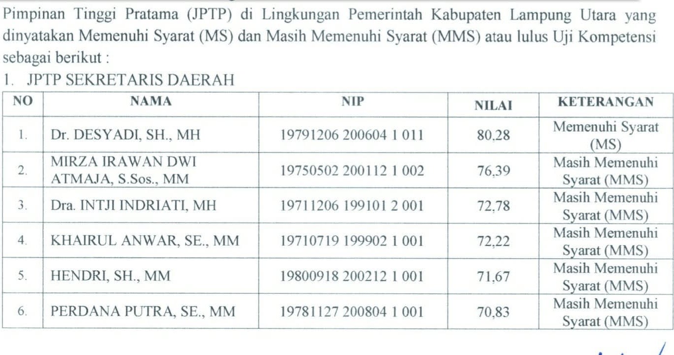 Diketahui, Desyadi saat ini menjabat Kepala Badan Pengelola Pajak dan Retrebusi Daerah (BPPRD) Kabupaten Lampung Utara. Dari hasil tahapan ini Desyadi memperoleh nilai 80,28.