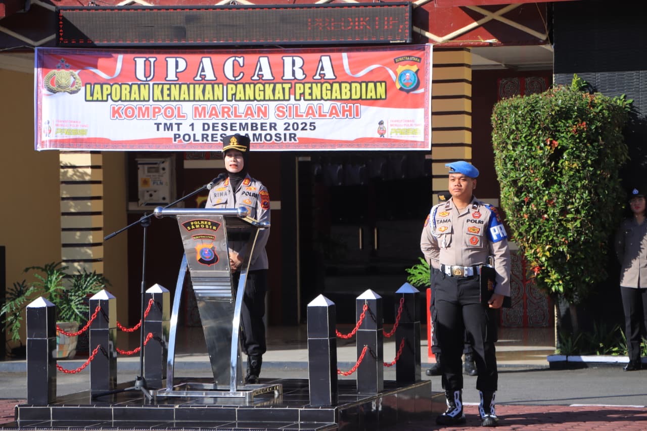 Samosir, www.sinarpagiindonesia.com – Kapolsek Onanrunggu, Marlan Silalahi, resmi menerima kenaikan pangkat pengabdian dari Ajun Komisaris Polisi (AKP) menjadi Komisaris Polisi (Kompol). Upacara laporan kenaikan pangkat tersebut digelar pada Senin, 1 Desember 2025 pukul 08.00 WIB di Lapangan Apel Mako Polres Samosir, yang dipimpin langsung oleh Kapolres Samosir, AKBP Rina Frillya, S.I.K.
