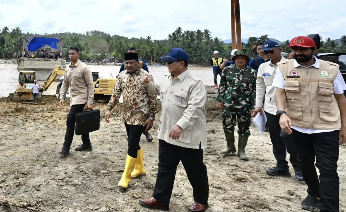 Setibanya di lokasi, Presiden Prabowo langsung meninjau titik konstruksi yang berada di tepi aliran sungai dan menyaksikan dari dekat operasi alat berat.