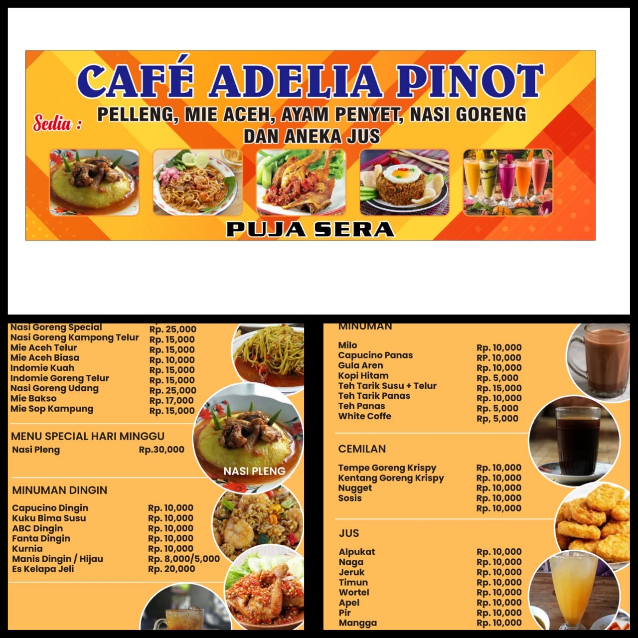 Café Ádelia Pinot menawarkan berbagai menu andalan seperti Ayam Penyet, Mie Aceh, Nasi Goreng, hingga Indomie aneka varian, serta Mie Bakso dan Mie Sop Kampung. Selain itu, café ini juga menghadirkan menu spesial hari Minggu, Nasi Pleng (Pelleng) yang menjadi ciri khas dan daya tarik tersendiri bagi pengunjung.
