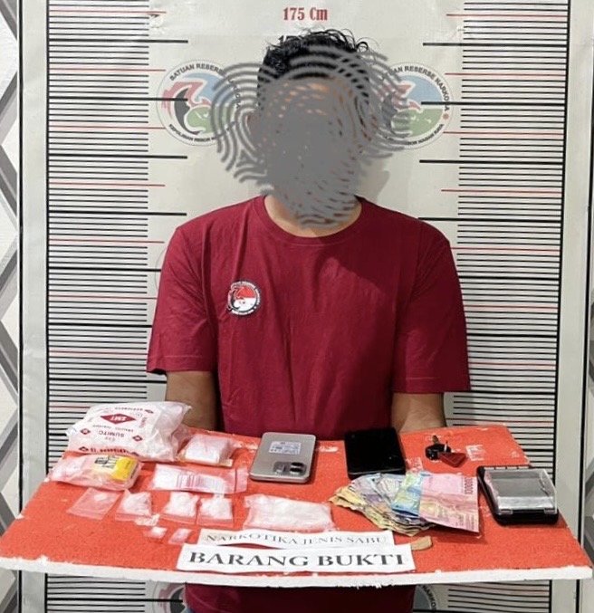 Saat diamankan, tersangka kedapatan membawa satu paket sabu di tangan kirinya. Dari hasil penggeledahan lanjutan di rumah tersangka di Desa Langkak, petugas menemukan tambahan enam paket sabu lainnya beserta sejumlah barang bukti pendukung.
