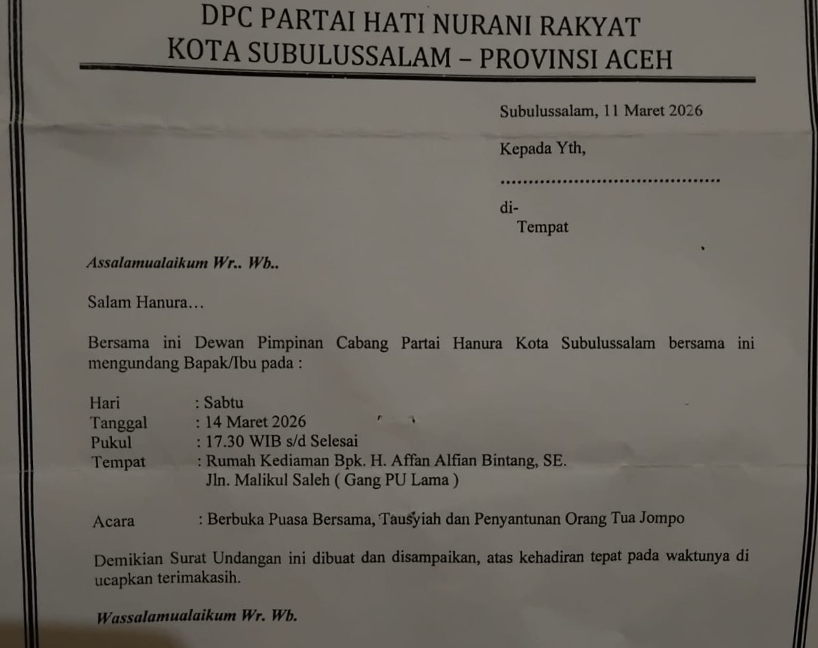 Aceh Subulussalam, www.sinarpagiindonesia.com – Dalam rangka mempererat silaturahmi serta meningkatkan kepedulian sosial di bulan suci Ramadan, Partai Hati Nurani Rakyat (Hanura) melalui Dewan Pimpinan Cabang Kota Subulussalam akan menggelar kegiatan Buka Puasa Bersama, Tausiyah Ramadan, dan Santunan untuk Orang Tua Jompo