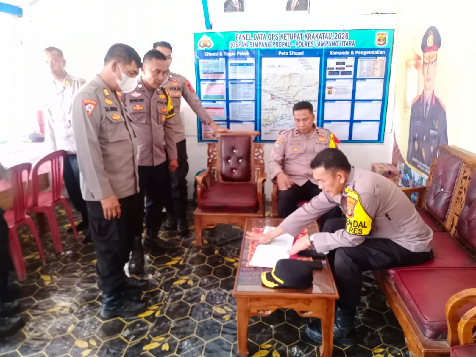 Selain itu, dilakukan juga penyampaian data terkait pelaksanaan Operasi Ketupat Krakatau 2026, pengecekan Sprin piket, serta memastikan penggunaan aplikasi SOT oleh personel yang bertugas di pos pengamanan dan pos pelayanan.